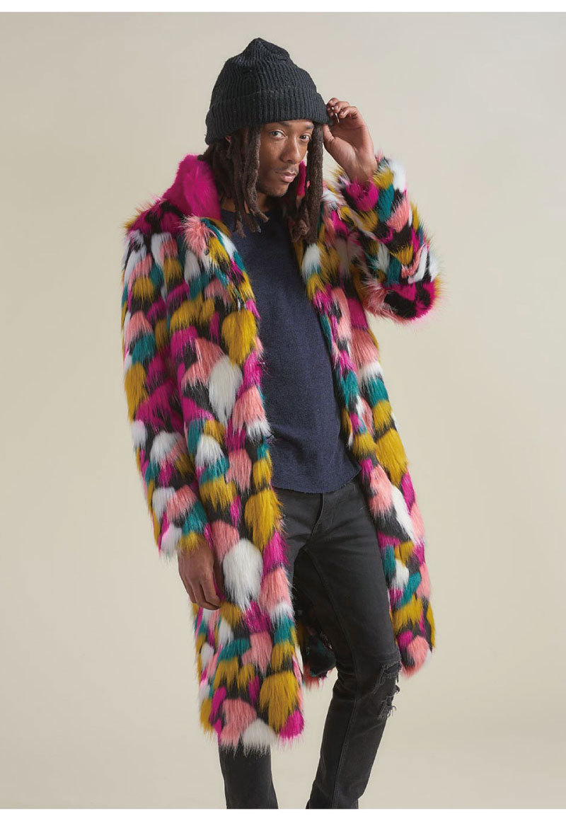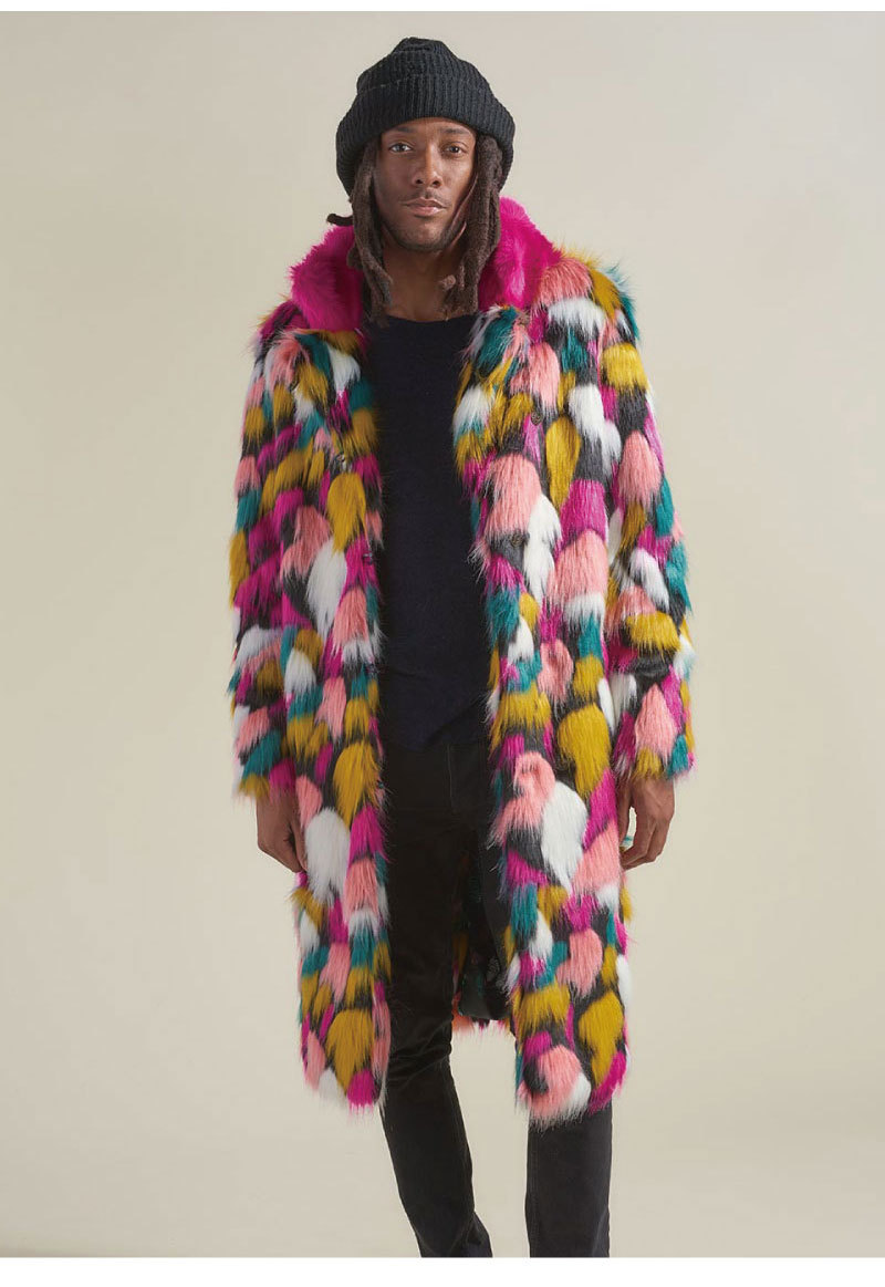 アマゾンの越境冬の男性はキツネの毛皮のコートをまねて帽子の中の長いゆったりしたコートの毛羽のコートを連ねます。