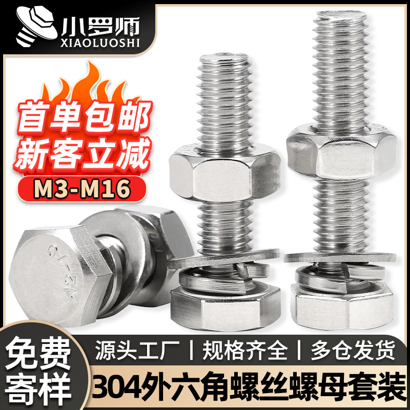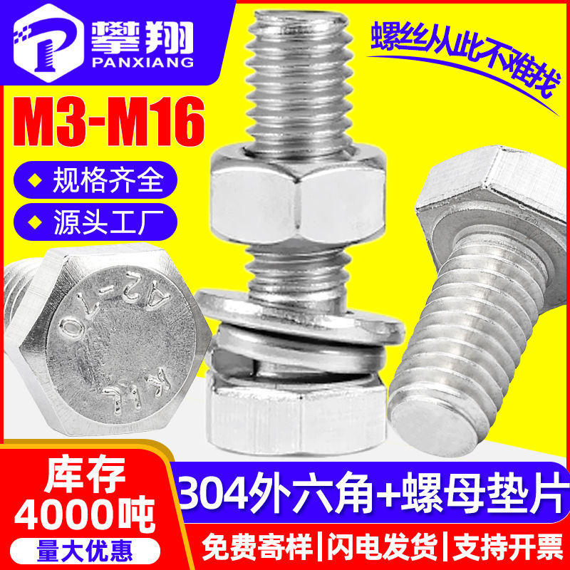 304ステンレス外六角ねじセット平パッド弾パッドナットdin933全ねじ六角ボルト
