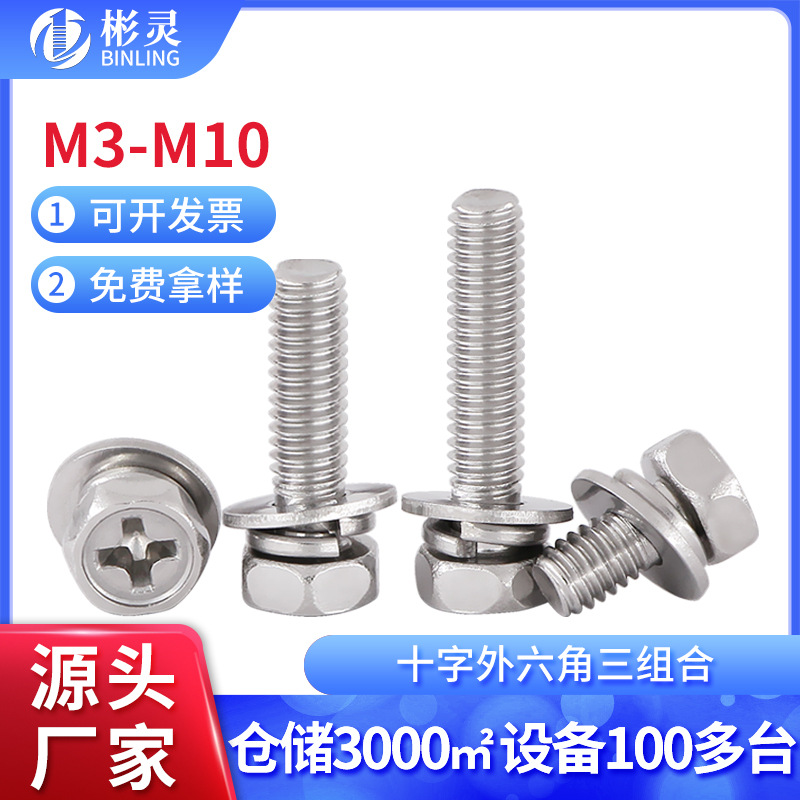 304ステンレス鋼外六角頭三連組合ネジM4-M0十字外六角組合平座金ネジセット