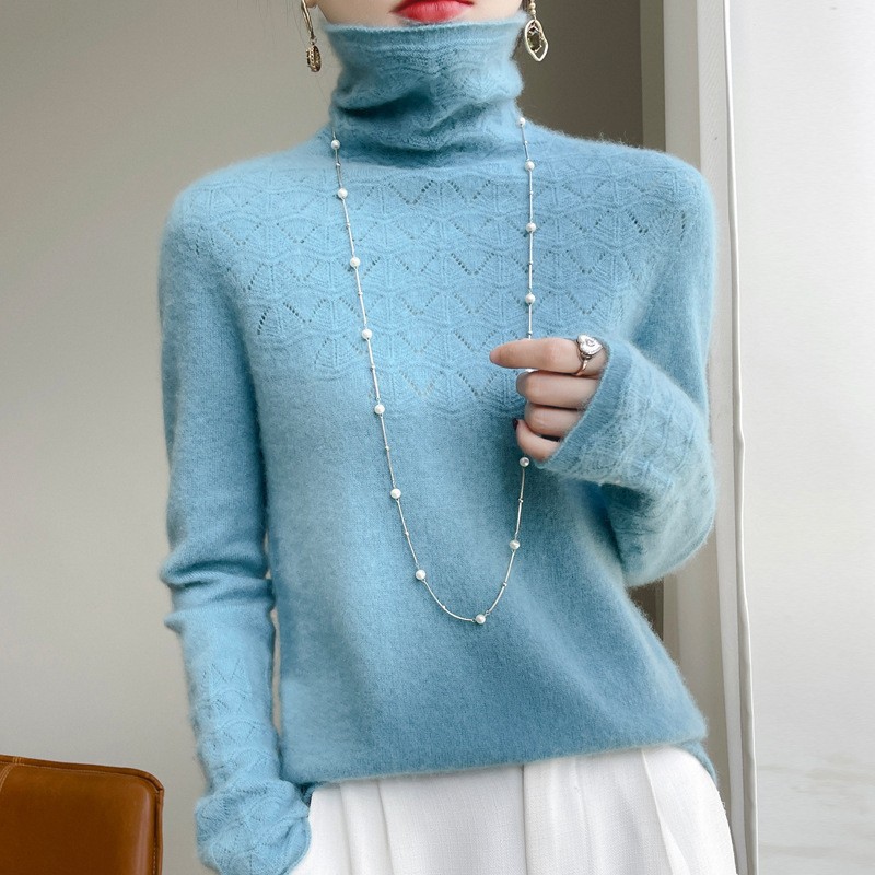 秋冬新款100%羊毛衫女士堆堆领镂空提花套头针织高领毛衣打底衫