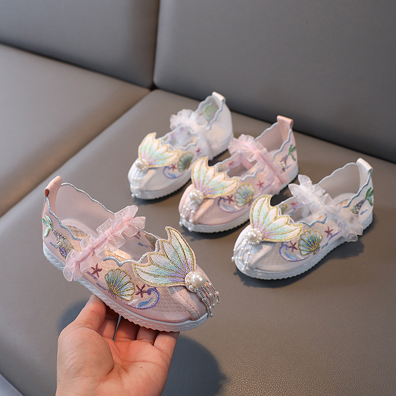 夏の女の子の漢服の靴ネットの子供の刺繍の靴の中国風の布の靴のダンスの靴の柔らかい底の表はダンスの靴を演出します。