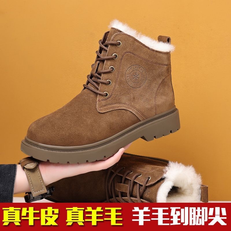 全ウール冬牛革綿靴男とベルベットの厚い防寒靴の毛皮一体雪地靴