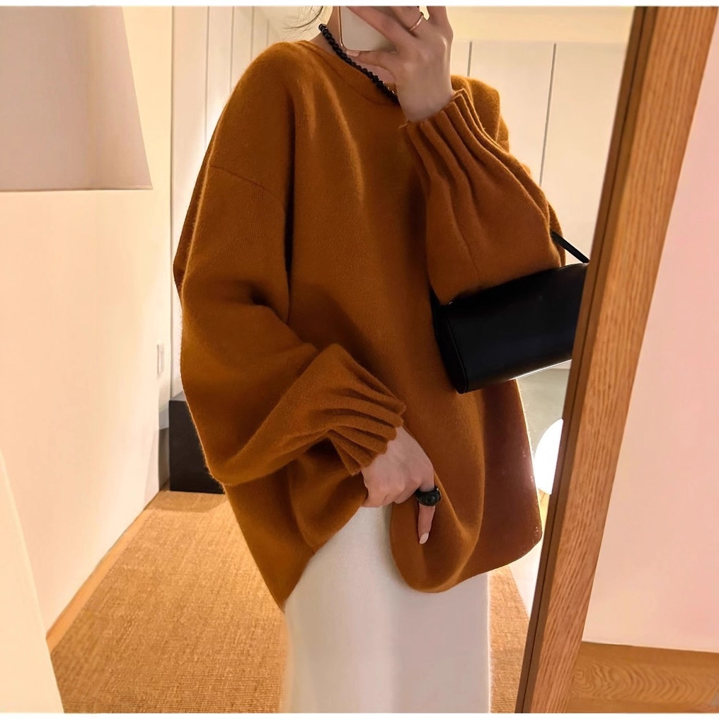 韩系设计感毛衣女新款灯笼袖圆领套头宽松慵懒中长款秋冬针织衫潮