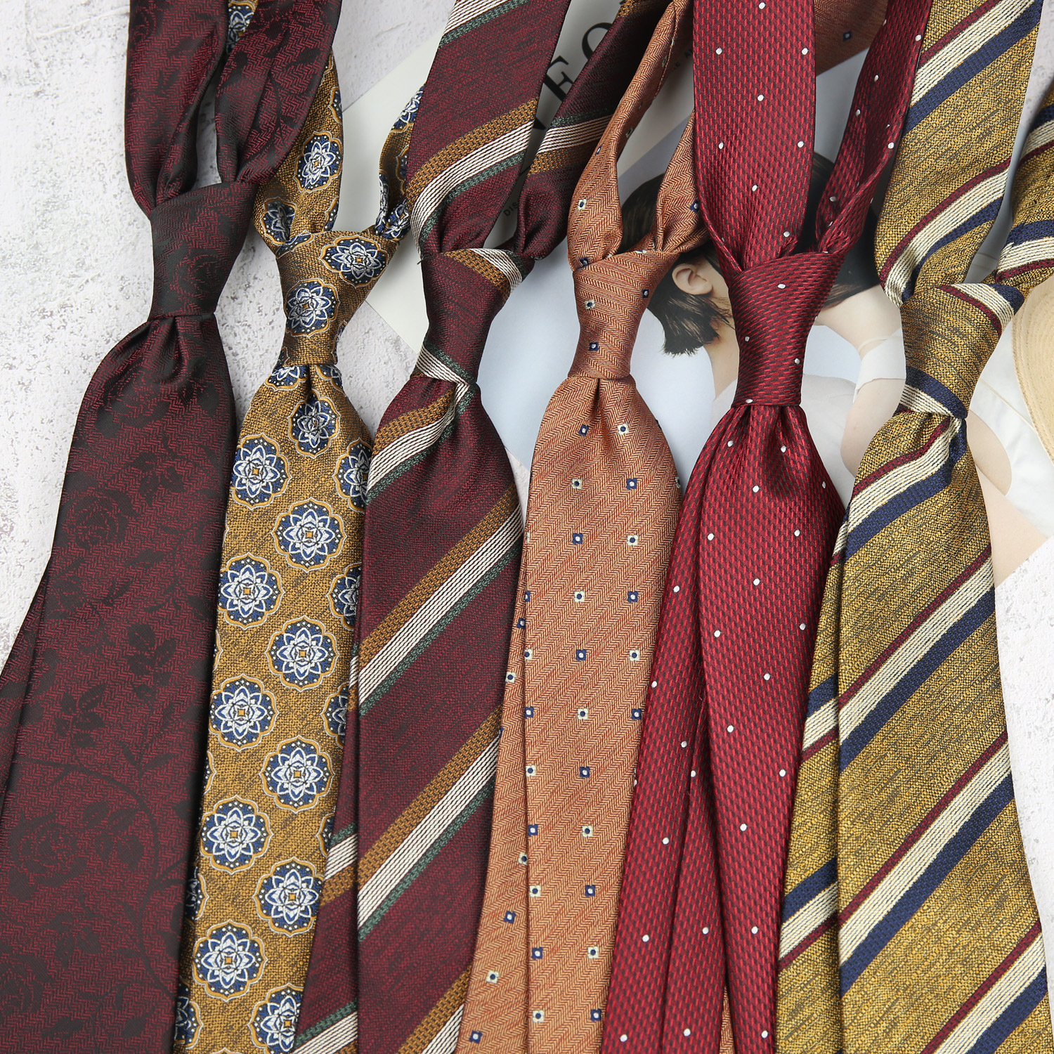 男性はレトロな結婚をしています。新しいカジュアルな手は8cmストライプのワインレッドのビジネス行政新郎ネクタイをしています。