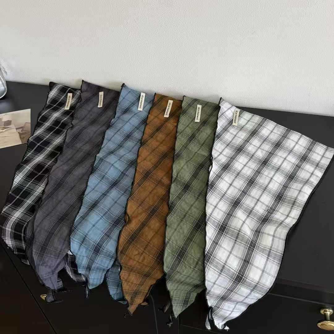日系棉麻复古格纹三角巾春秋薄款叠穿搭配屁帘文艺系脖丝巾包头巾