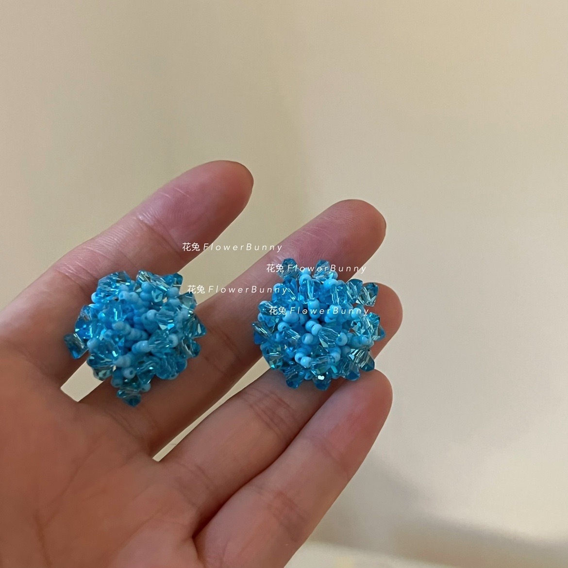 青いビーズピアス重工手編み刺繍イヤリング白リゾート風耳クリップ蚊取り盤s925