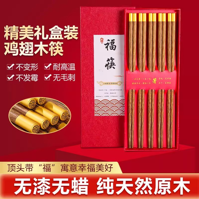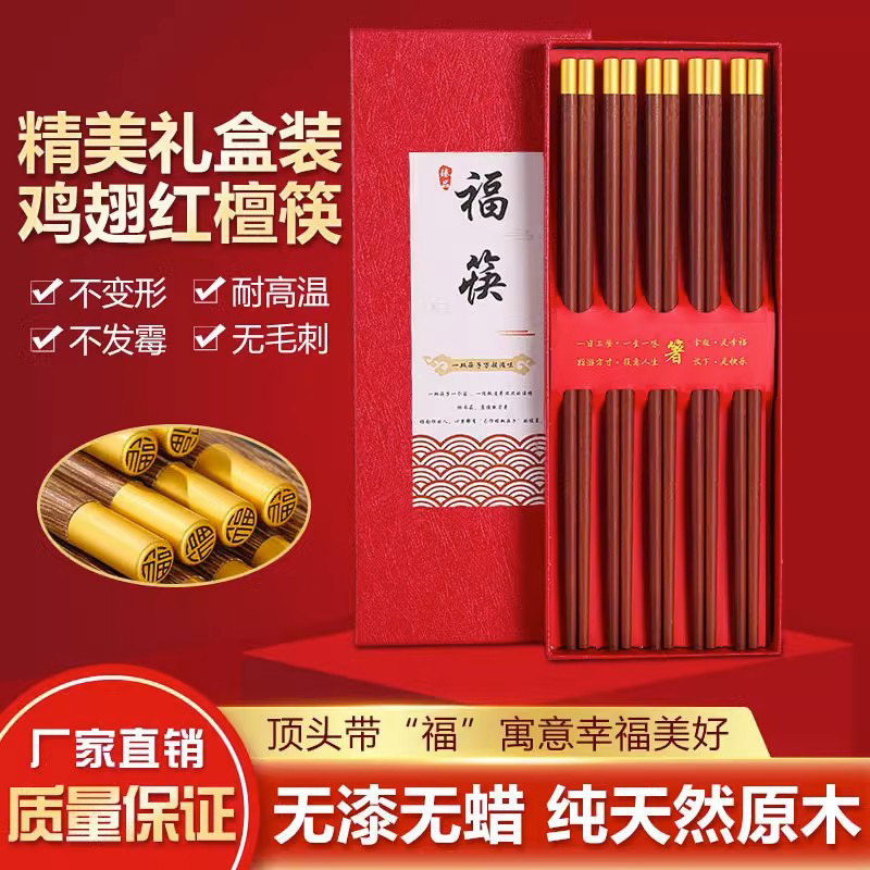 鸡翅木筷子马年筷子礼盒包装新年红檀木筷子家用实木福筷无漆无蜡