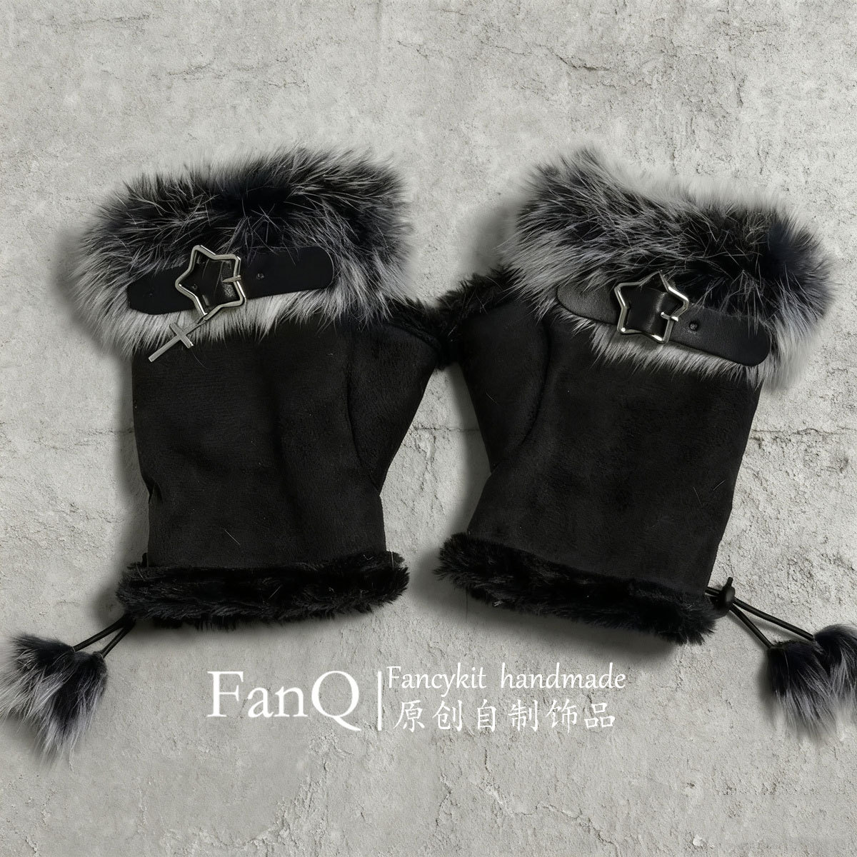 原创亚文化毛绒手套秋冬咖色女保暖加绒加厚兔毛半指露指键盘手套