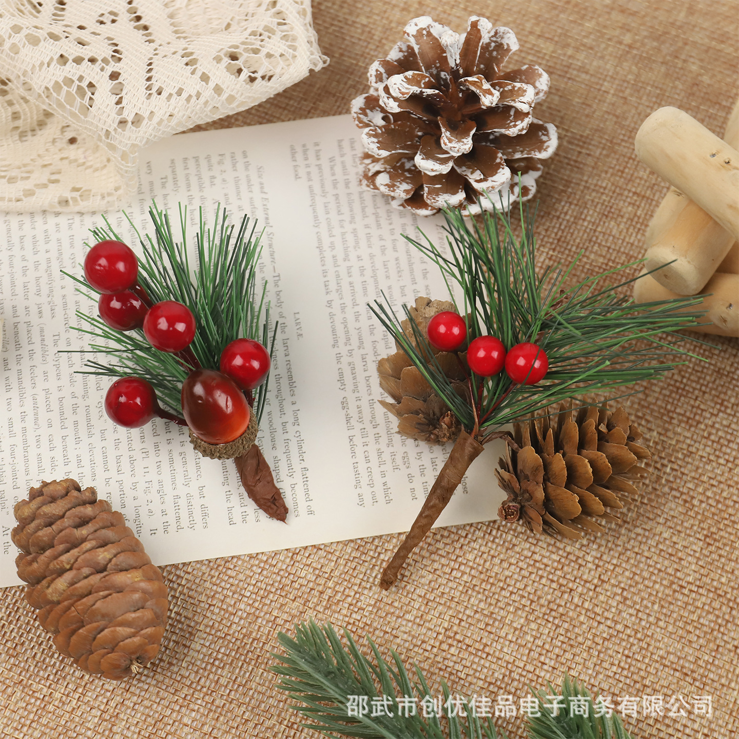 跨境人造松果松枝松针红果挂件圣诞品装饰仿真花松树枝干摆件饰品