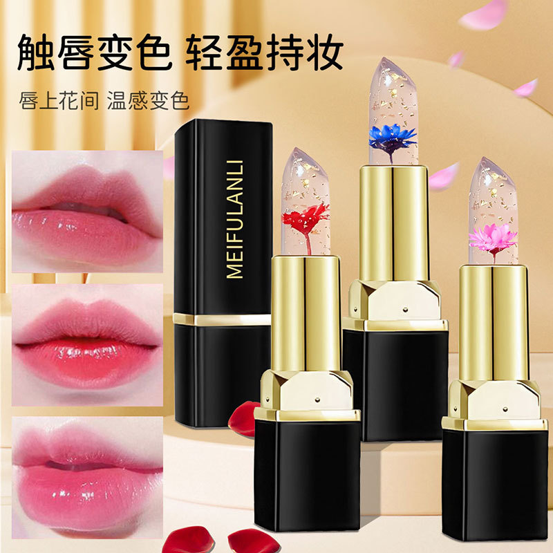 生花ゼリーの口紅が透き通って変色した口紅は保湿防水が長持ちします。