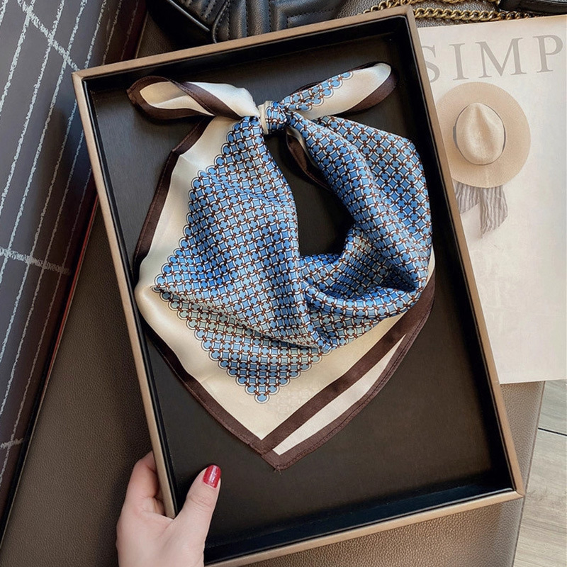 100%桑蚕丝53真丝缎面蓝色几何方巾女春夏季薄款韩版时尚百搭丝巾