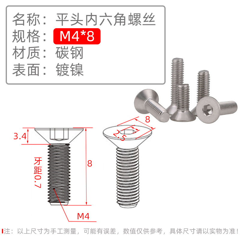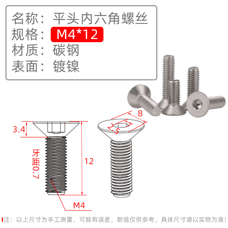 製品仕様 M4 x 8平頭六角穴付きねじ,M4 x 10平頭六角穴付きねじ,M4 x 12平頭六角穴付きねじ,M 5x10平頭六角穴付きねじ,M 5x12平頭六角穴付きねじ,M 5x16平頭六角穴付きねじ,M6x10 皿頭六角穴付きボルト,M6x12平頭六角穴付きねじ,M6x14 皿頭六角穴付きネジ,M6x16平頭六角穴付きねじ,M 6x20平頭六角穴付きねじ,M6x25平頭六角穴付きねじ,M8x16平頭六角穴付きねじ,M8x20平頭六角穴付きねじ,M8x25平頭六角穴付きねじ