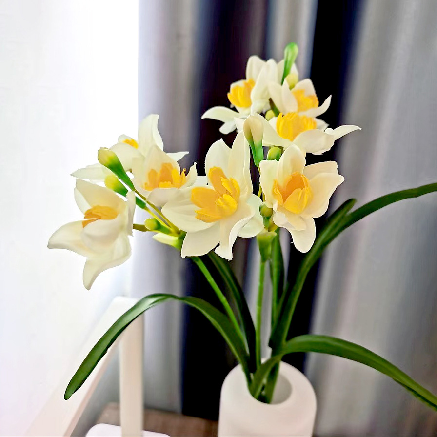 北欧の小清新な洋水仙の室内の食卓に造花の単枝絹布の田園の風格の水仙の花を飾ることをシミュレーションします。