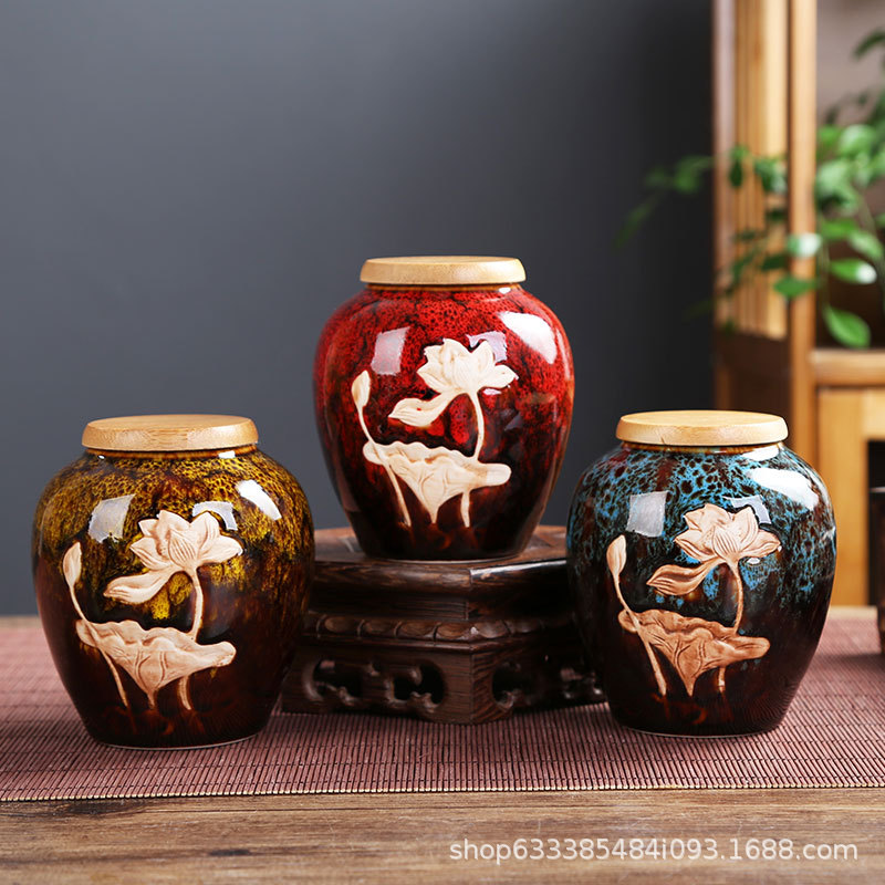 窯変蓮茶葉缶家庭用密封缶レトロ陶磁器貯蔵缶プーアル茶紅緑茶防湿聚香缶