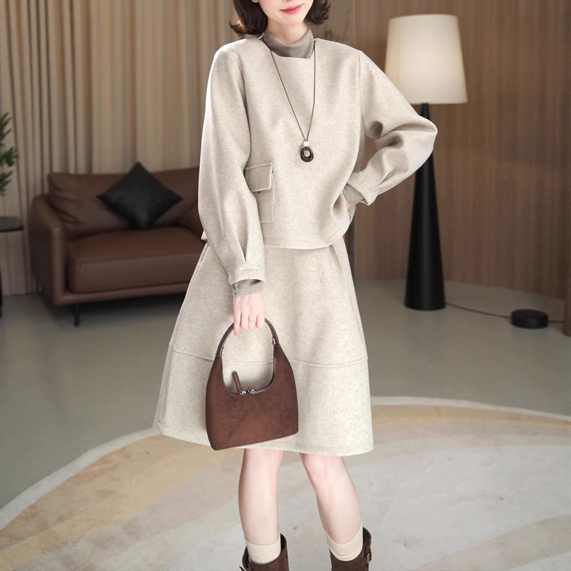 2026年秋冬新作ウールコート婦人服、上品な小香風トップスとショートスカートの痩身効果のあるカジュアルツーピースセット