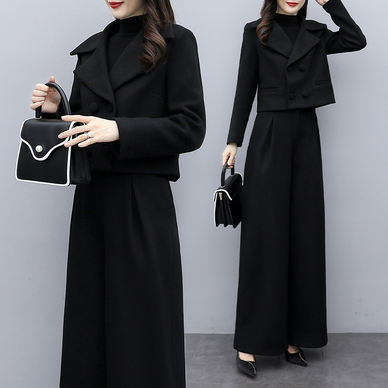 冬の新型の小香風毛は2つのズボンの女性服のファッション的な気質の黒色のカジュアルなワイドパンツのスーツのスーツのスーツのスーツのスーツです。