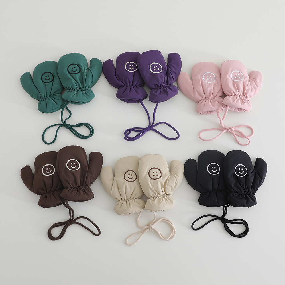 儿童手套秋冬加棉加厚连指保暖防水可爱笑脸滑雪手套宝宝防风挂脖