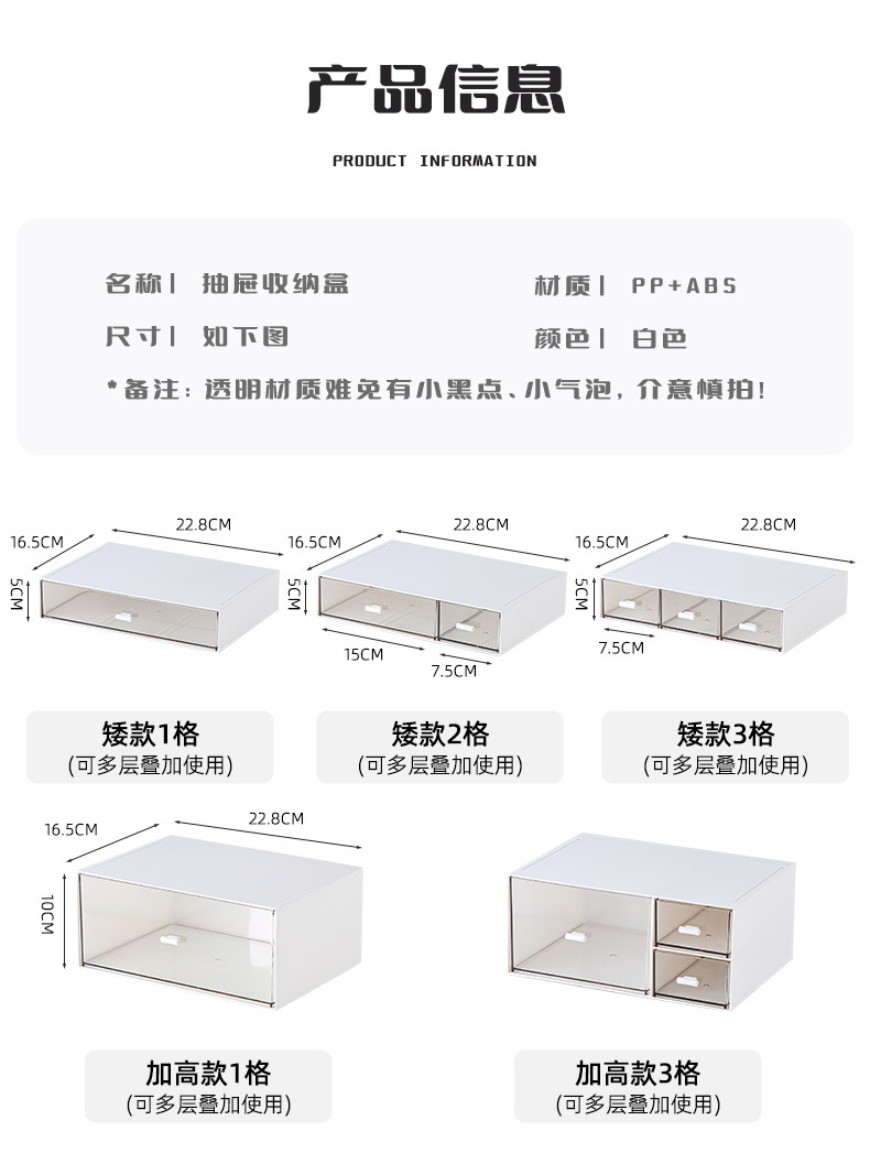 加高可叠加抽屉收纳盒单格/双格/大号抽屉收纳盒 | 产品材质:HIPS+PS包装方式:热缩膜