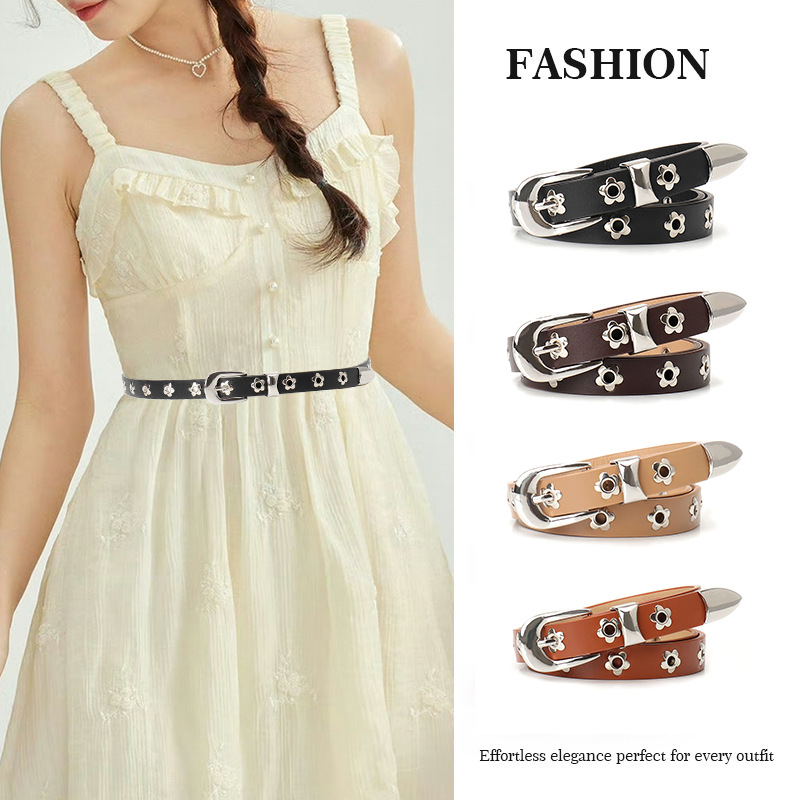 铆钉花朵气眼欧美PU皮女士腰带配短裙短裤小众设高级感皮带黑色潮