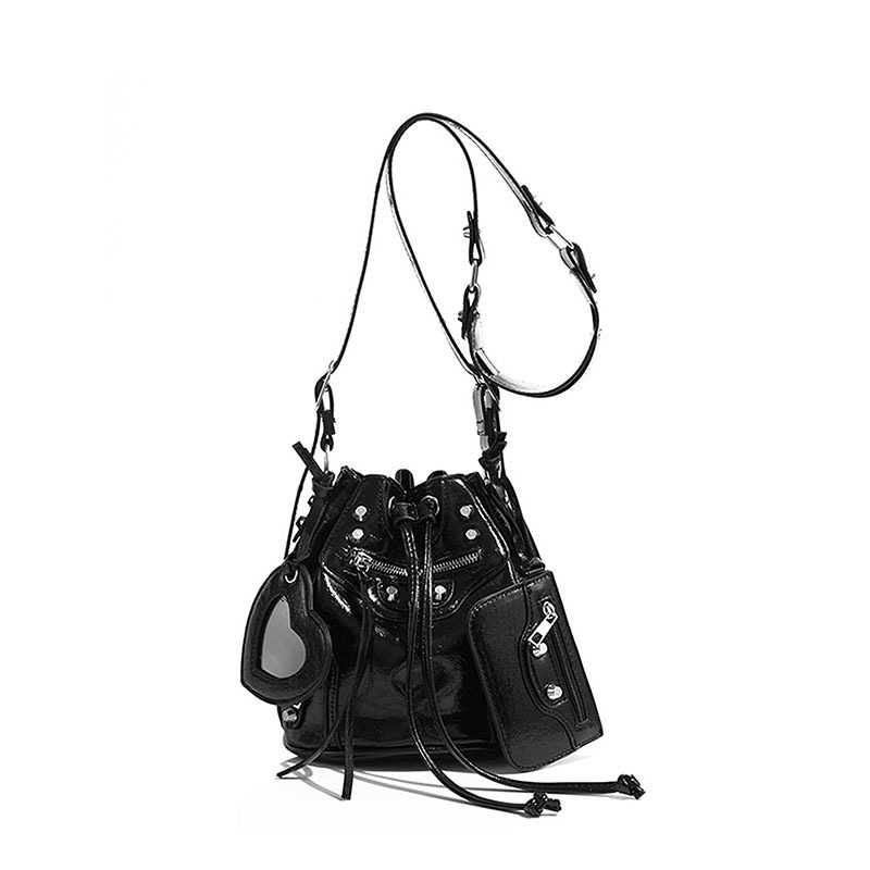 小众设计包包斜挎包女高级感复古机车朋克Y2K辣妹铆钉抽带水桶包