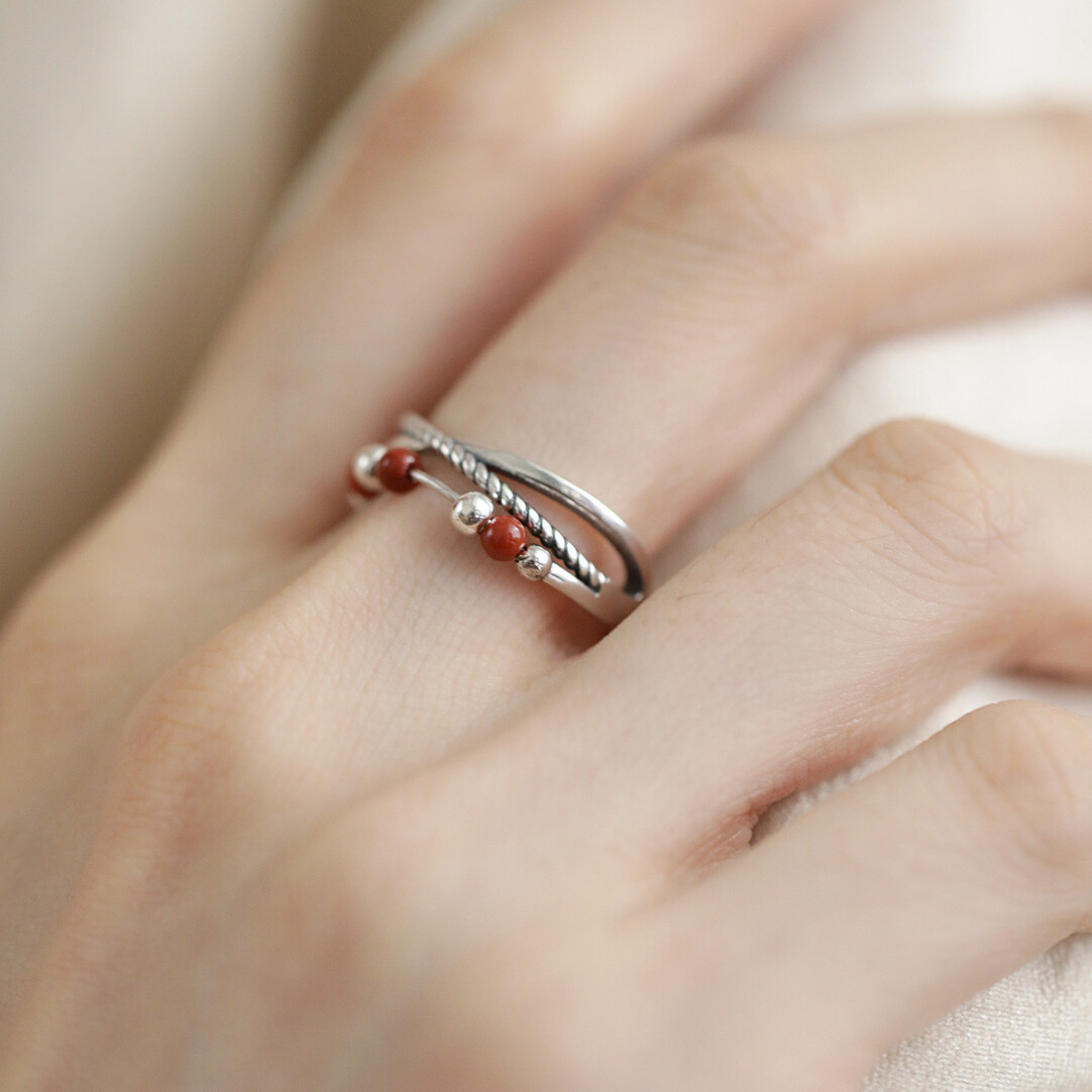 925银复古新中式路路通转运珠戒指环南红玛瑙可移动三层开口调节