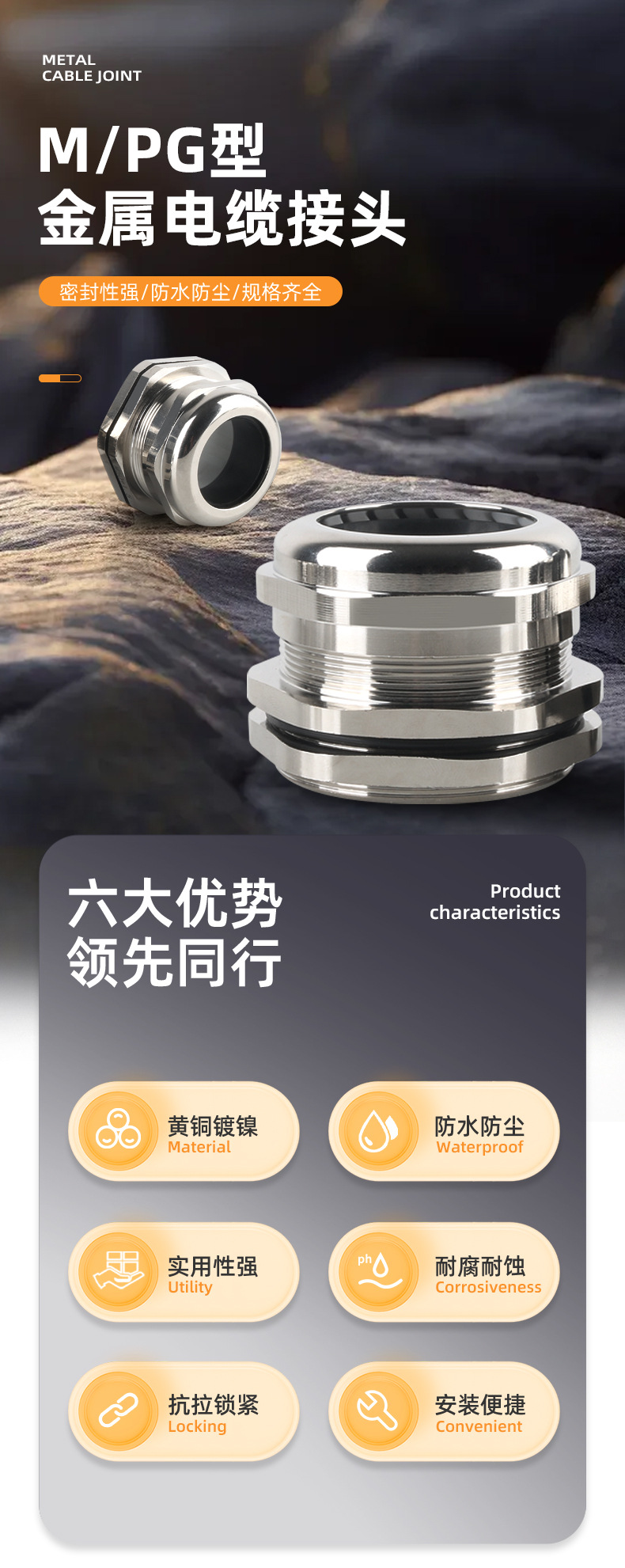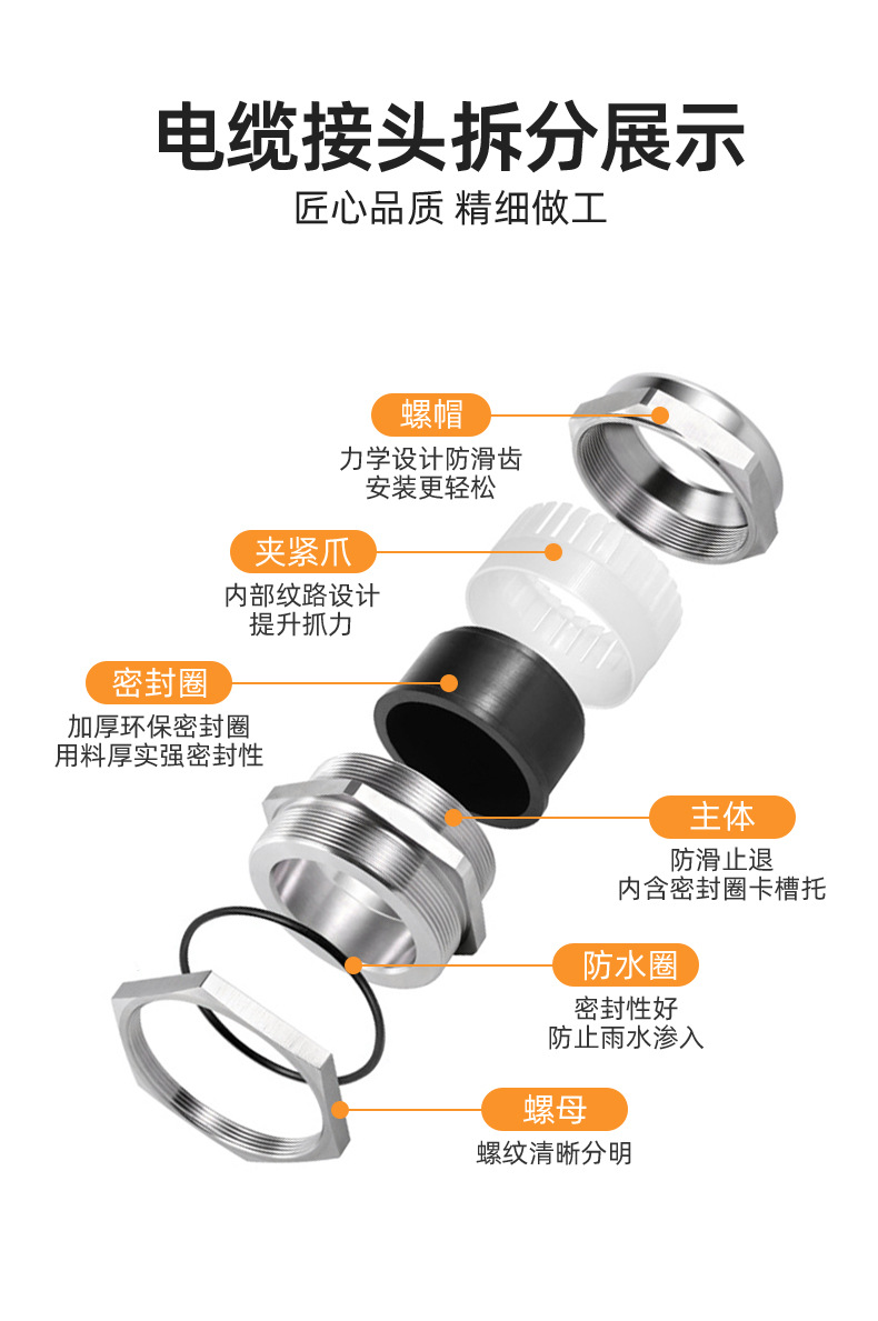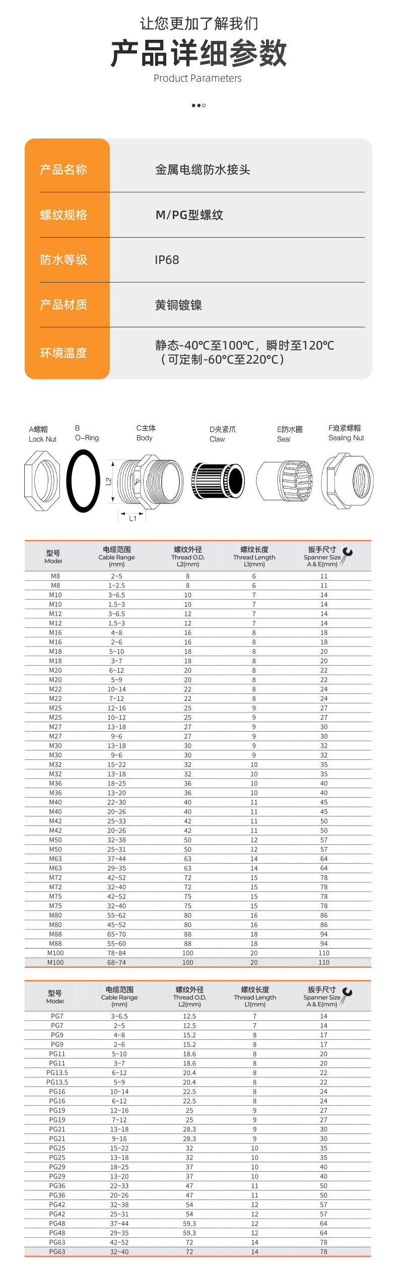 M6*1 (ラインスルーレンジ2~4mm),M8*1.25(通し線範囲2~4mm),M8*1.25(通し線範囲2~5mm),M10*1 (スレッド範囲 3-6.5mm),M12*1.5(スレッド範囲3-6.5mm),M12*1.5 (スレッド範囲 4-8mm),M14*1.5 (スレッド範囲 4-8mm),M16*1.5(通しネジ範囲4~8mm),M16*1.5 (ラインスルーレンジ5-10mm),M18*1.5(通し線範囲5~10mm),M20*1.5(ワイヤー通過範囲6~12mm),M20*1.5 (ラインスルーレンジ10-14mm),M22*1.5(ワイヤー通過範囲10~14mm),M24*1.5(ワイヤー通過範囲10~14mm),M25*1.5 (ライン範囲 10 ~ 14),M25*1.5 (ワイヤー範囲 12-16mm),M25*1.5(ワイヤー通過範囲13~18mm),M27*1.5(ワイヤー通過範囲13~18mm),M28*1.5(通しネジ範囲13~18mm),M30*1.5(配線範囲15-22mm),M32*1.5(ワイヤー通過範囲15~22mm),M33*1.5(ワイヤー通過範囲15~22mm),M36*1.5(ワイヤー通過範囲18-25mm),M37*1.5(ワイヤー通過範囲18~25mm),M40*1.5 (ワイヤー範囲 22-30mm) 接続,M42*1.5(ワイヤー通過範囲22~30mm),M47*1.5(ワイヤー通過範囲25~33mm),M48*1.5(ワイヤー通過範囲25~33mm),M50*1.5(ワイヤー通過範囲32~38mm),M54*1.5(スレッド範囲32~38mm),M60*1.5(スレッド範囲37-44mm),M63*1.5(ワイヤー通過範囲37~44mm),M64*1.5(ワイヤー通過範囲37~44mm),M70*1.5(スレッド範囲42-52mm),M72*1.5(スレッド範囲42~52mm),M75*1.5(ワイヤー通過範囲42~52mm),M80*1.5(スレッド範囲55-62mm),M88*1.5(ワイヤー範囲65-70mm),M90*1.5(ワイヤー通過範囲65~70mm),M100*1.5(スレッド範囲78-84mm),PG7(スルーワイヤー範囲3~6.5mm),PG9 (パススルーライン範囲 4-8mm),PG11(パススルーライン範囲5~10mm),PG13.5(スルーワイヤー範囲6~12mm),PG16(ライン通過範囲10~14mm),PG19(ケーブル通過範囲10~14mm),PG21(ライン通過範囲13~18mm),PG25(スルーワイヤー範囲16~21mm),PG29 (パススルーライン範囲 18-25mm),PG36(ライン通過範囲22~30mm),PG42 (パススルーライン範囲 32-38mm),PG48 (ライン範囲 37-44mm),PG63 (パススルーライン範囲 42-52mm)