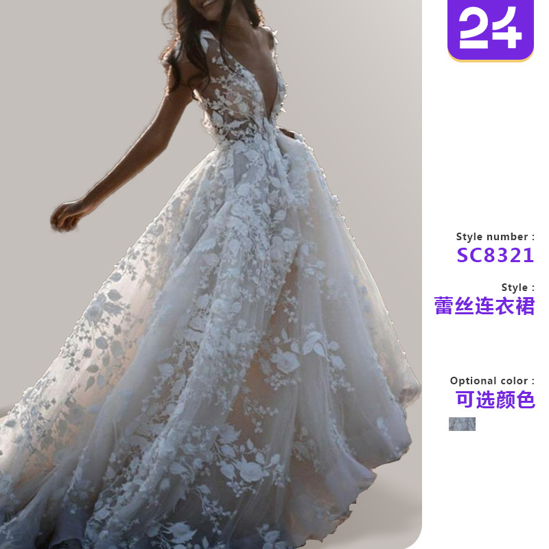 2025 クロスボーダー春の新作レディースアマゾンヨーロッパとアメリカのレースドレスディープ V ウェディングドレス大きなスカート