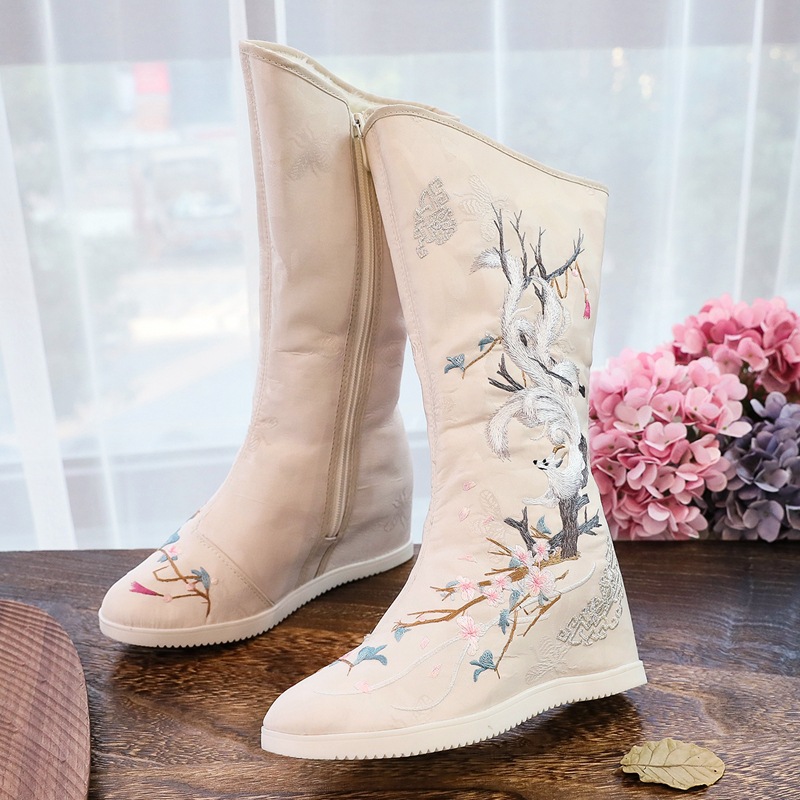 女性用漢服靴、ロングブーツ、ベルベット刺繍入り漢服ブーツ、古代衣装用身長アップコットンブーツの値下げセール