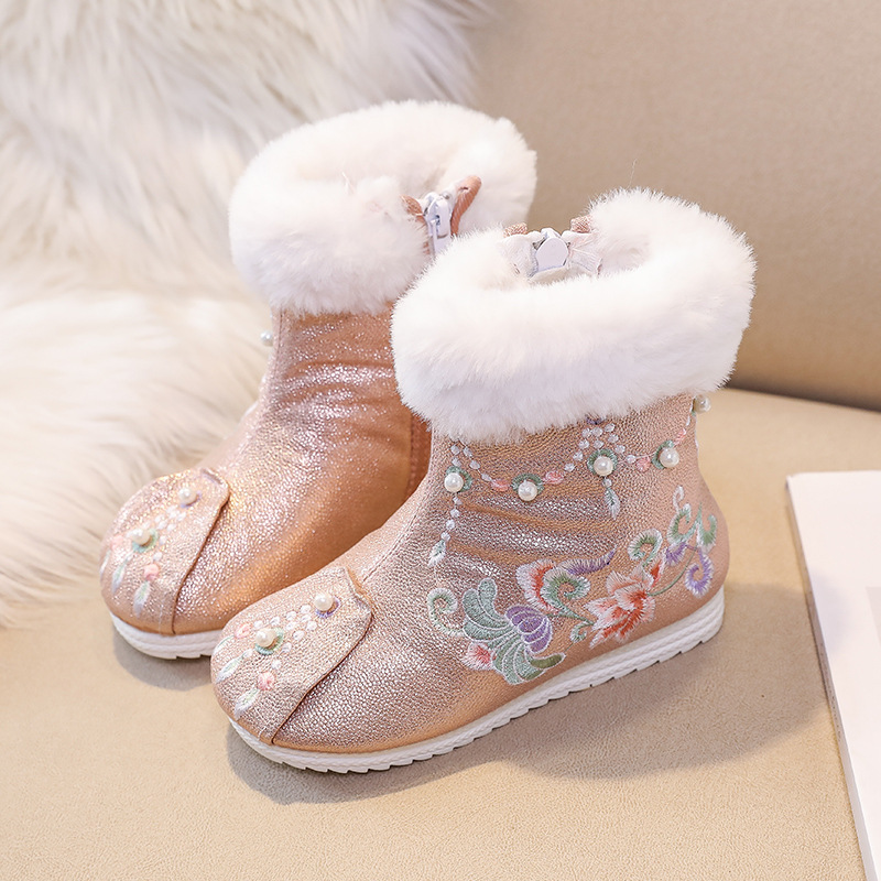 新しい子供のベルベットの綿の靴秋冬の新しい保温漢服の子供の靴の女の子の雪の靴の柔らかい底の刺繍の靴のショートブーツ