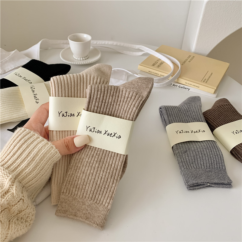 秋冬の新しいカシミヤの靴下の女性の日本の復古の双針の靴下の縦縞のウールの積み重ねの靴下の純色の中筒の靴下