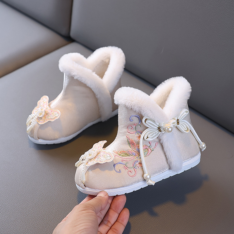 新しい冬の古着靴女の子中国風雪地靴刺繍靴子供綿靴漢服靴新年靴