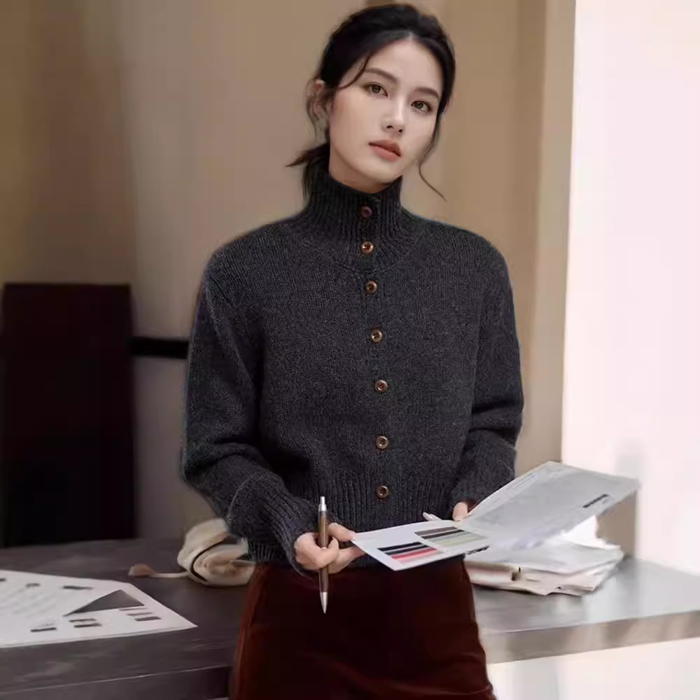 フランスのレトロな茶色の短いスタンドカラーのセーターのカーディガンのコートの女性の秋冬の中に底の高襟のウールのニットを掛けます。