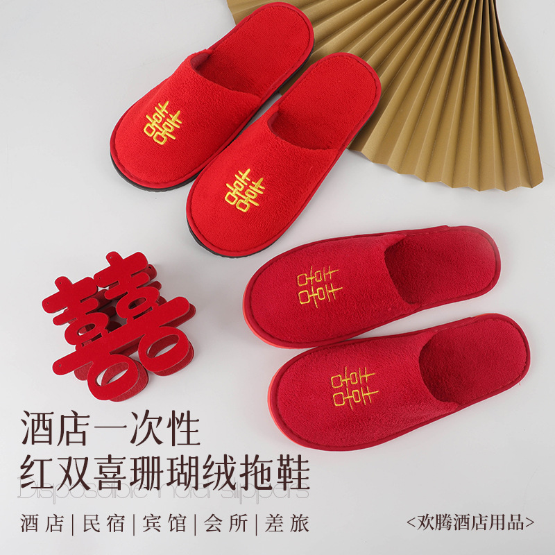 中国の結婚式の赤いダブルハピネス使い捨て結婚式のスリッパホームホスピタリティB&Bホテルコーラルベルベットスリッパ