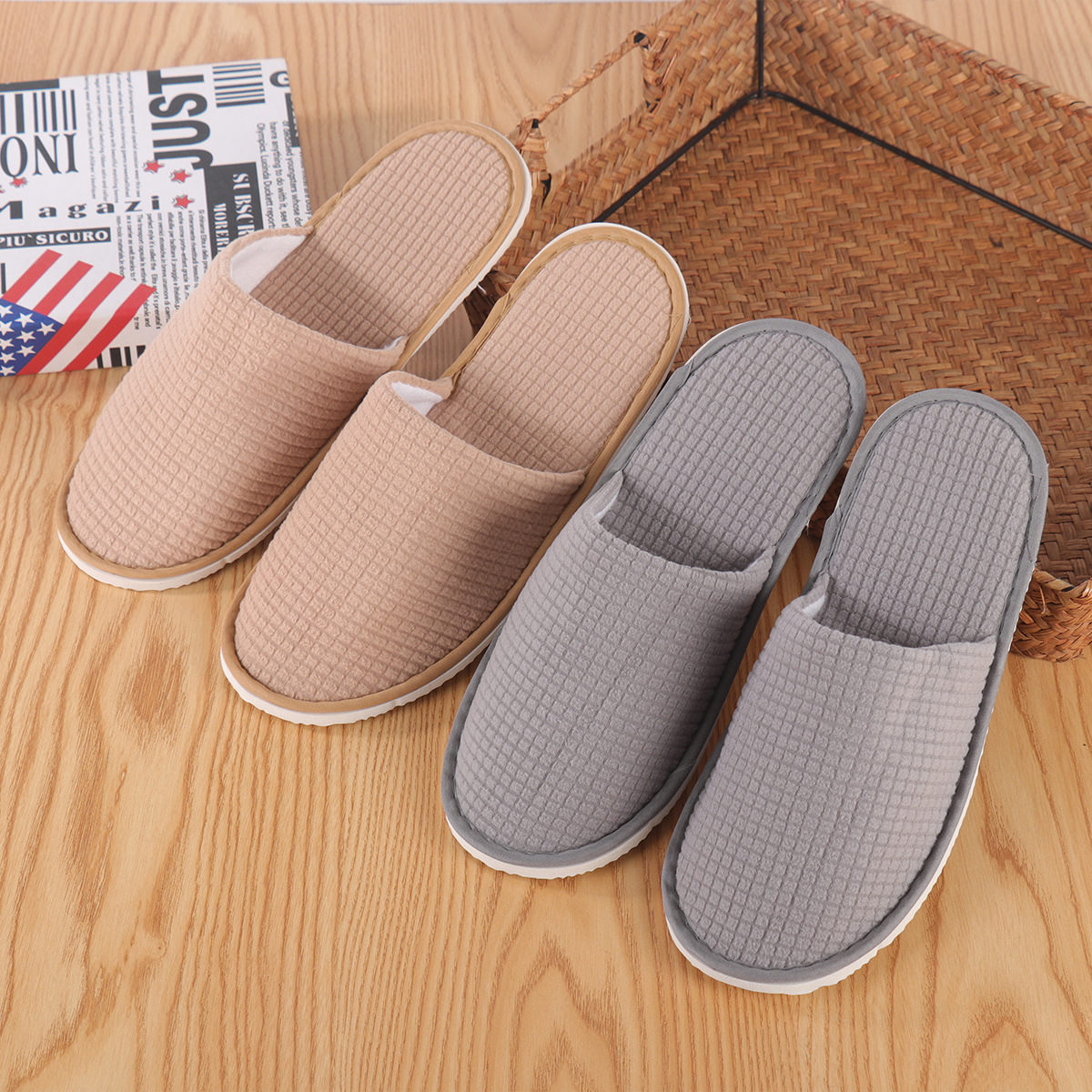 メーカーは使い捨てのワッフルスリッパを提供しています。