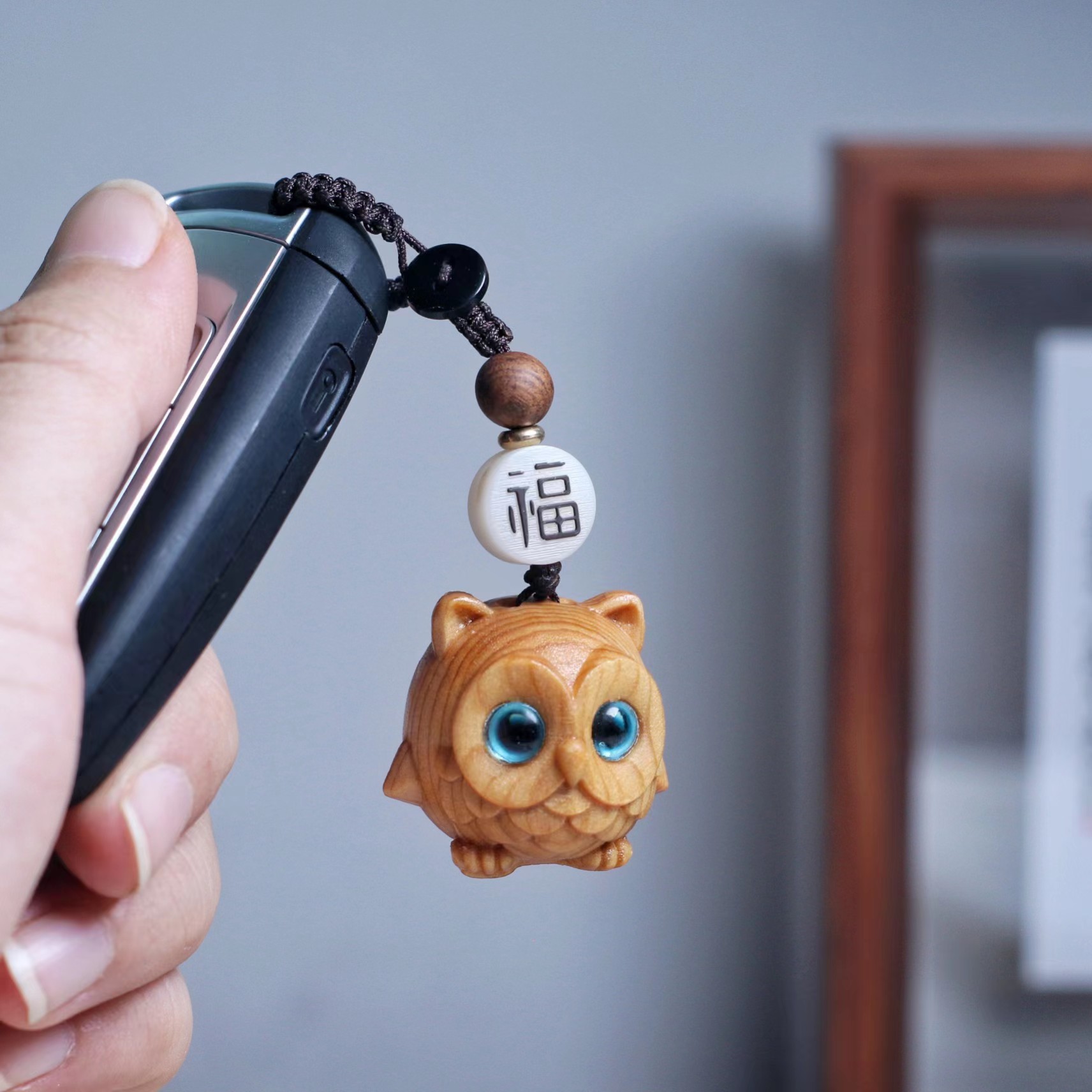 崖柏木彫りフクロウネット赤かわいいアニメ木製車キーホルダー女子高颜値男性高級