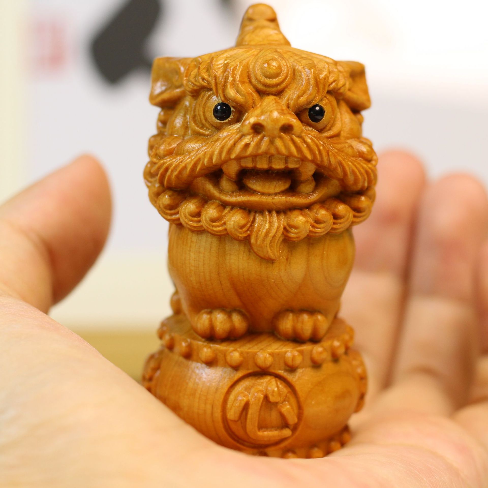 黄楊の木はライオンの頭を彫刻します。