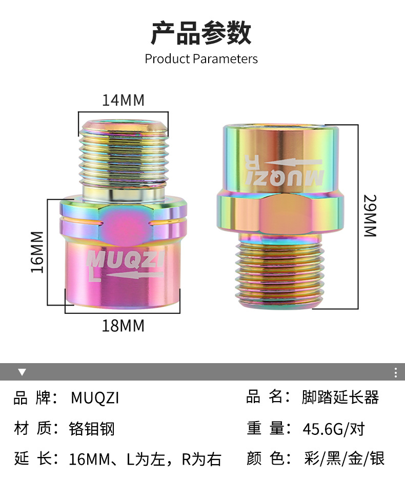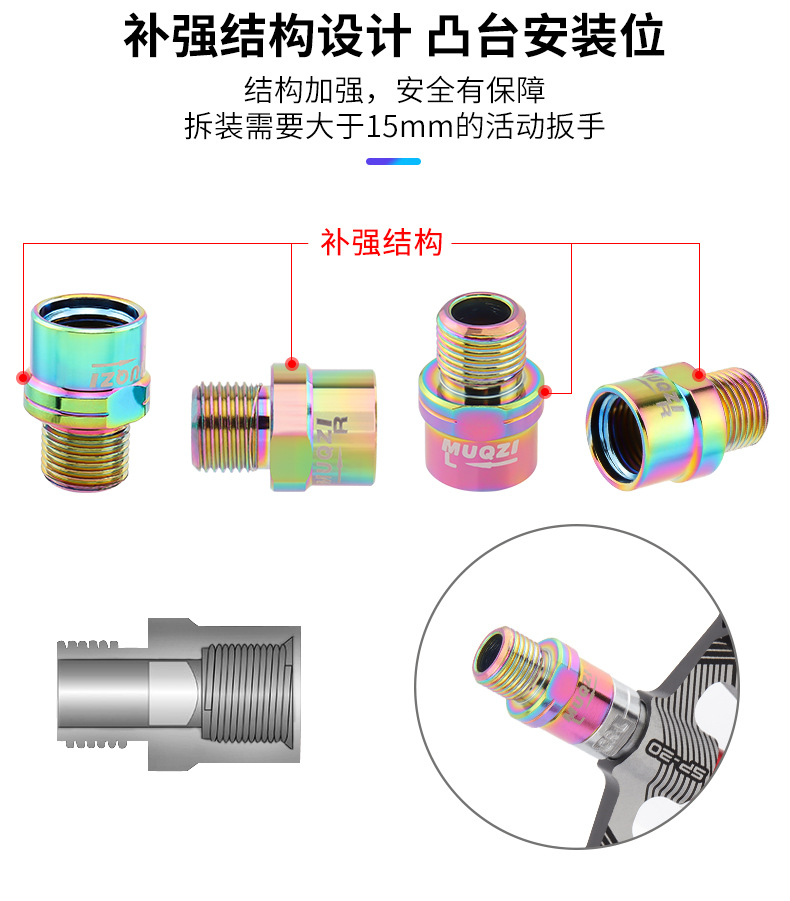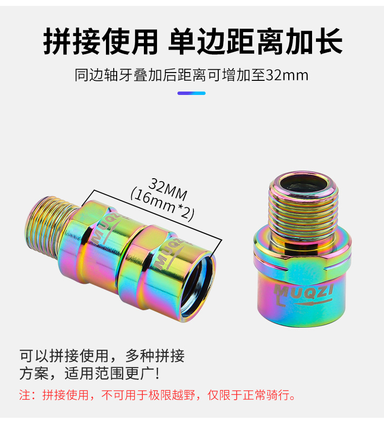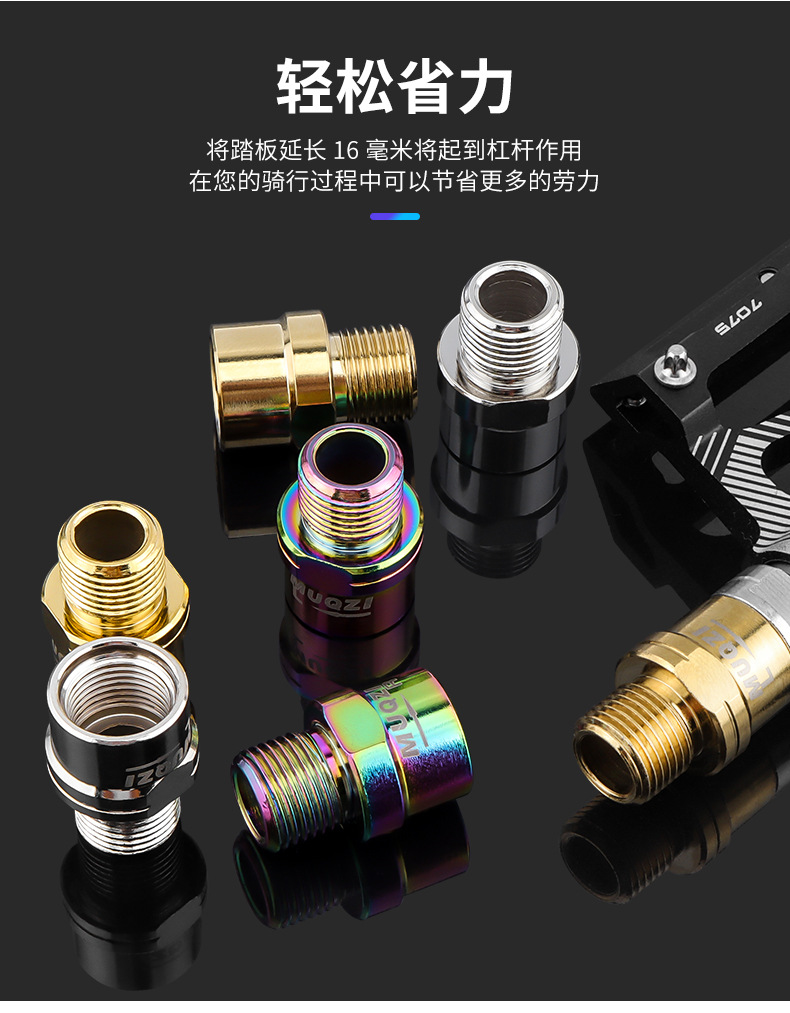 特点:延长轴芯起到杠杆定律更省力,如果您的脚比较宽大,会造成鞋与曲柄摩擦,也可解决。