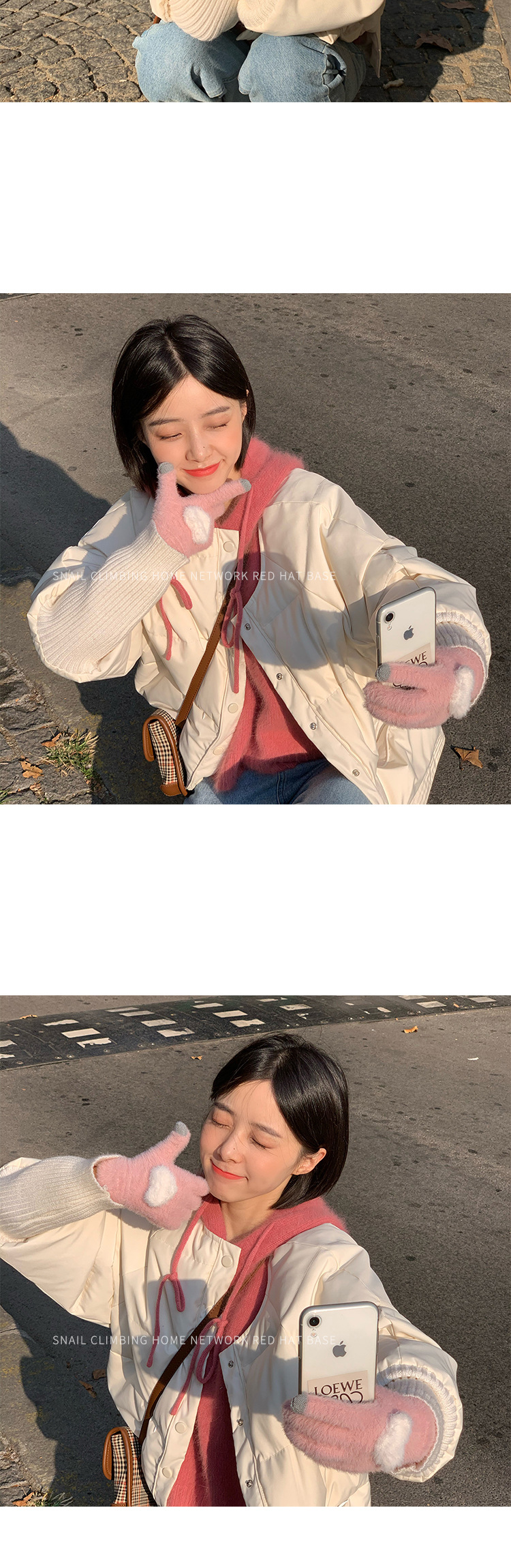 韩系粉色羊羔毛绒分指手套女冬季加绒保暖露指可触屏骑行防风防冻