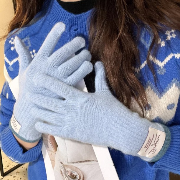 韩版ins~贴布标针织手套女秋冬季学生骑行保暖护手长款五指可触屏