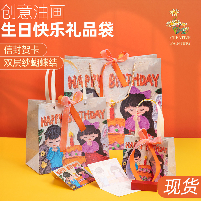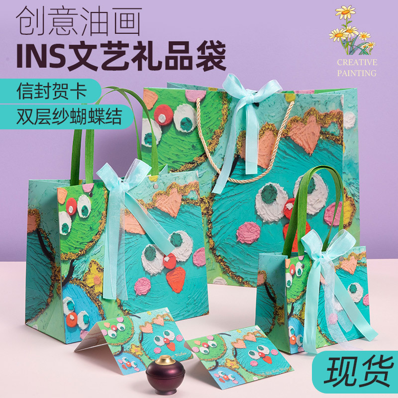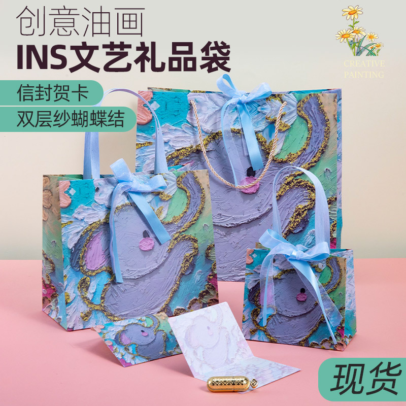 クリーム風油絵棒立体月映花間ギフト包装袋手提げ紙袋男女誕生日花束包装袋