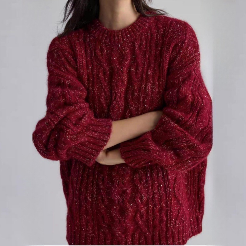 三股加厚重工欧货扭花纯羊毛衫女秋冬花纱宽松慵懒新年红色毛衣