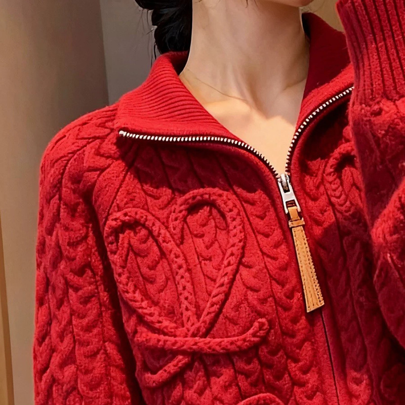 新年红色高领半拉链开衫女纯羊毛衫欧货秋冬绞花爱心针织毛衣外套