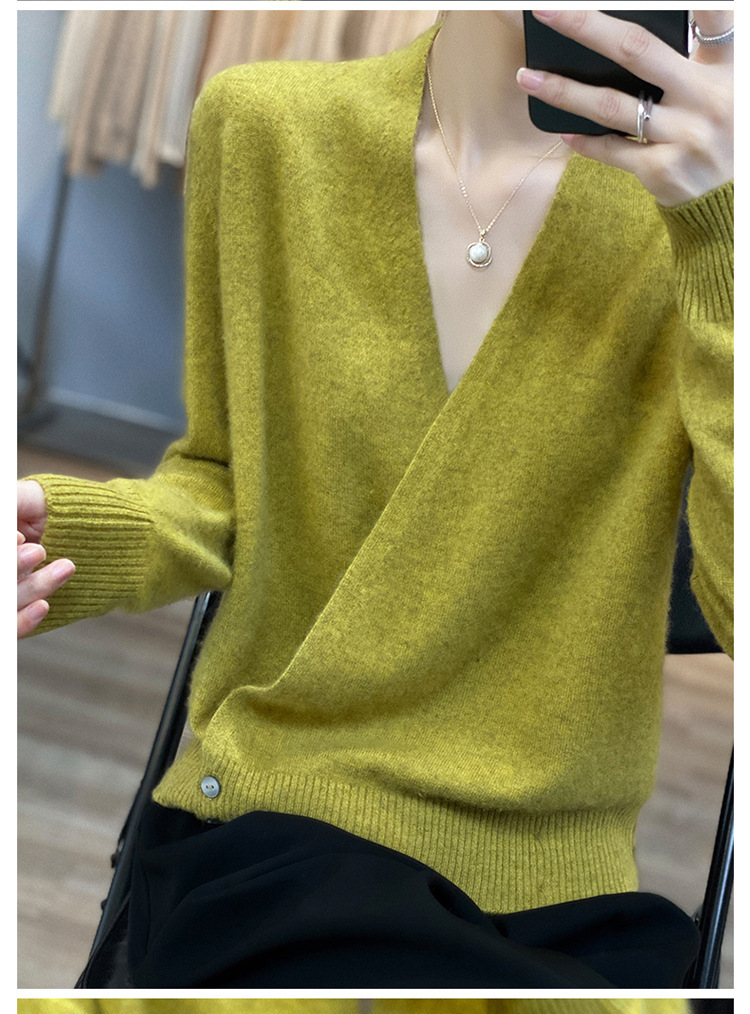 秋冬の新型ウールのカーディガンの女性の小さい大衆のデザイン感vネックのボタンのオーバーのセーターは交差して外にカシミヤのシャツを掛けます。