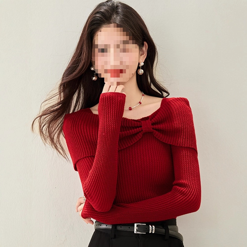 红色蝴蝶结内搭打底衫女秋冬高级感露锁骨针织衫法式独特别致上衣