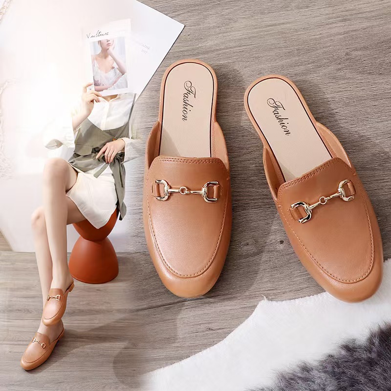 111-A1 [恵東易新達] レザーバックルトゥミュールスリッパ レディース ハーフスリッパ アウターウェアサンダル
