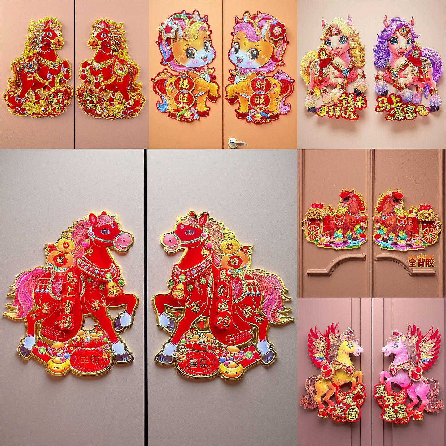 圆形款,生肖一个版,花鱼4个版。共5个版面。混搭发货,直径尺寸:34×34cm,撕不坏的PET金箔材质+高档绒布植绒撒粉完美结合工艺,彩用先进的液压技术,有凹凸立体层次感!采用双面金,真正的高档货,撕不坏PET土豪金箔,绒布撒金粉,送纳米无痕胶!牢固,耐用度高,不伤墙面,不伤身!没有印痕!是防盗门,玻璃门,推拉门,移门的首选.