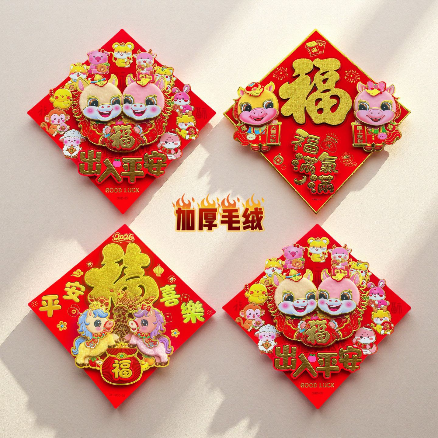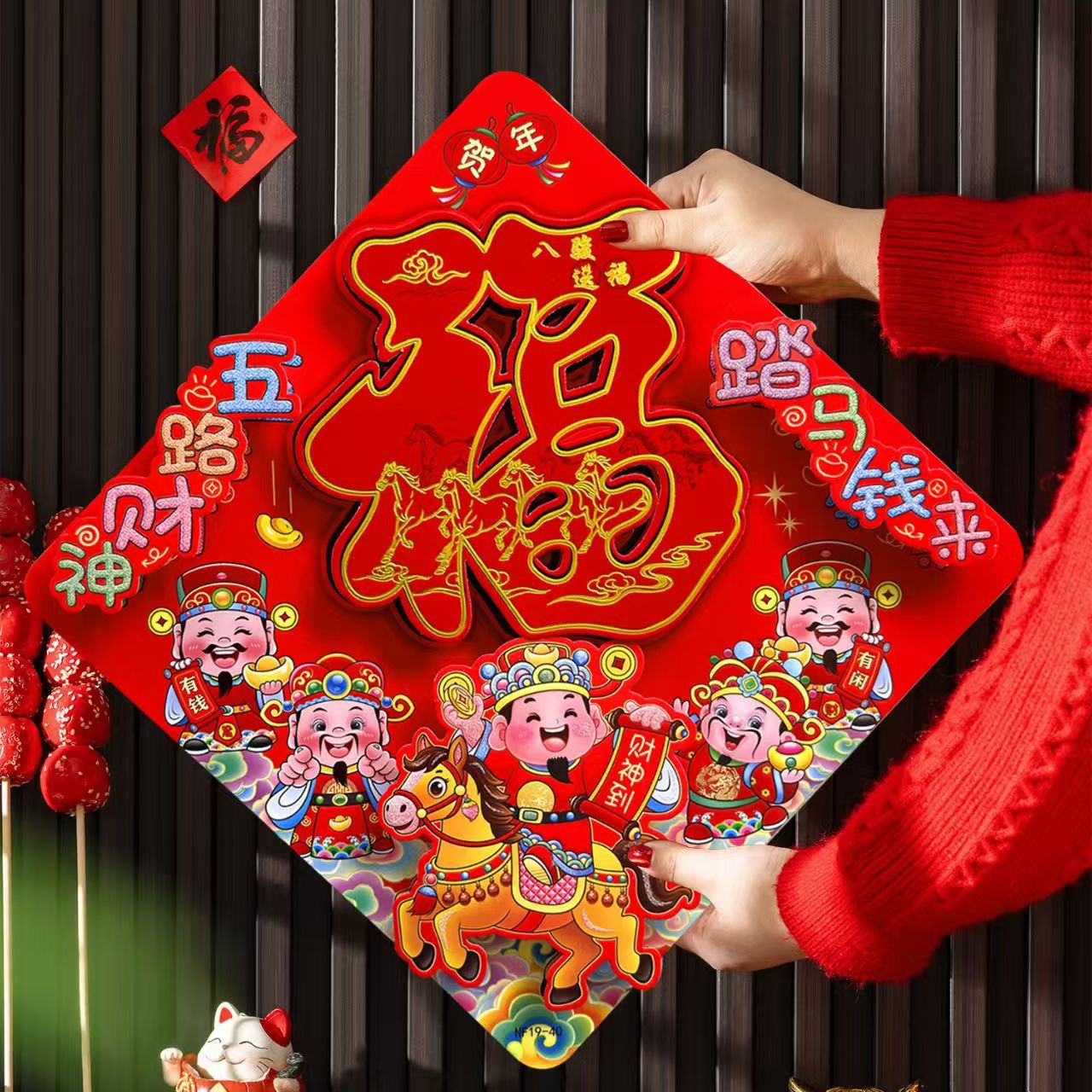 马年全背胶植绒立体福 马年新款上市.加厚卡纸植绒高档印花+撒金粉烫金工艺,中间贴金福,左右下三面都贴鱼和喜庆配件。非常的高端大气上档次。