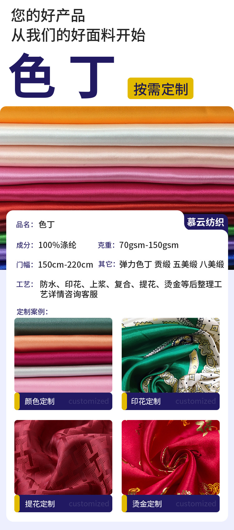 有光哑光加厚涤纶贡缎色丁布无弹细腻婚纱缎汉服公主裙婚庆布景