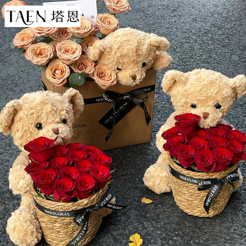 ネットの赤い熊は抱っこの桶の草を抱いて花のかごの仙子のキスのバラの花束の誕生日の包装の材料の花芸の花屋を編みます。