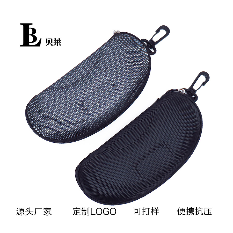 卸売EVA黒色ジッパー式メガネケース、フック付きサングラスケース、耐圧・落下防止、汎用サングラスケース、ロゴ印刷可能
